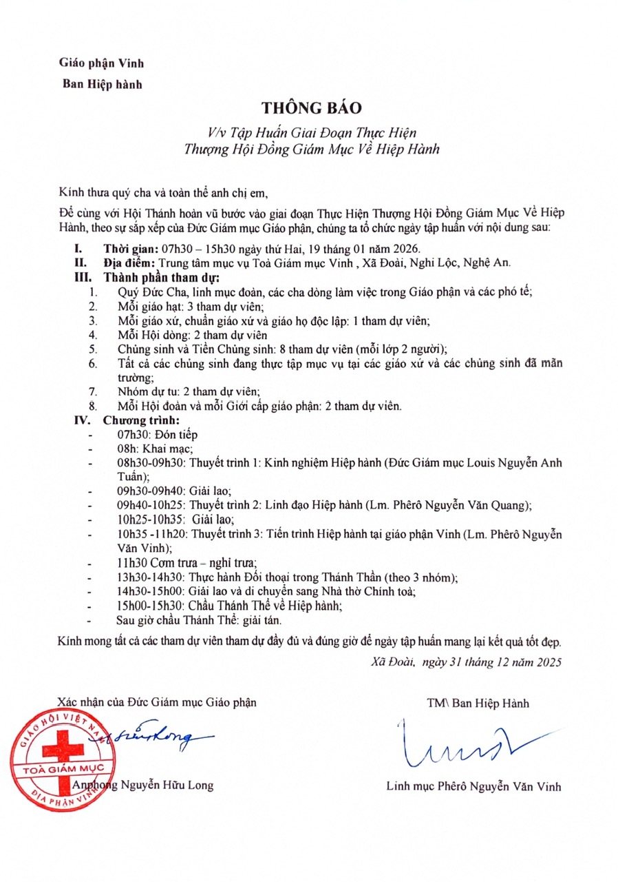 Ban Hiệp Hành Giáo phận Vinh: Thông báo Tập huấn giai đoạn thực..
