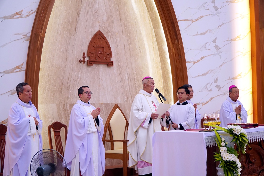 Ngỏ lời trước thánh lễ, Đức cha Anphong gửi lời chào thăm đến cộng đoàn hiện diện, đồng thời mời gọi mọi người cùng hợp ý với các tiến chức tạ ơn Chúa về hồng ân thánh chức hôm nay cũng như tha thiết cầu nguyện cho các thầy luôn được khôn ngoan, trung thành và bền đỗ trên con đường phục vụ để trở nên những người môn đệ truyền giáo của Chúa Kitô.
