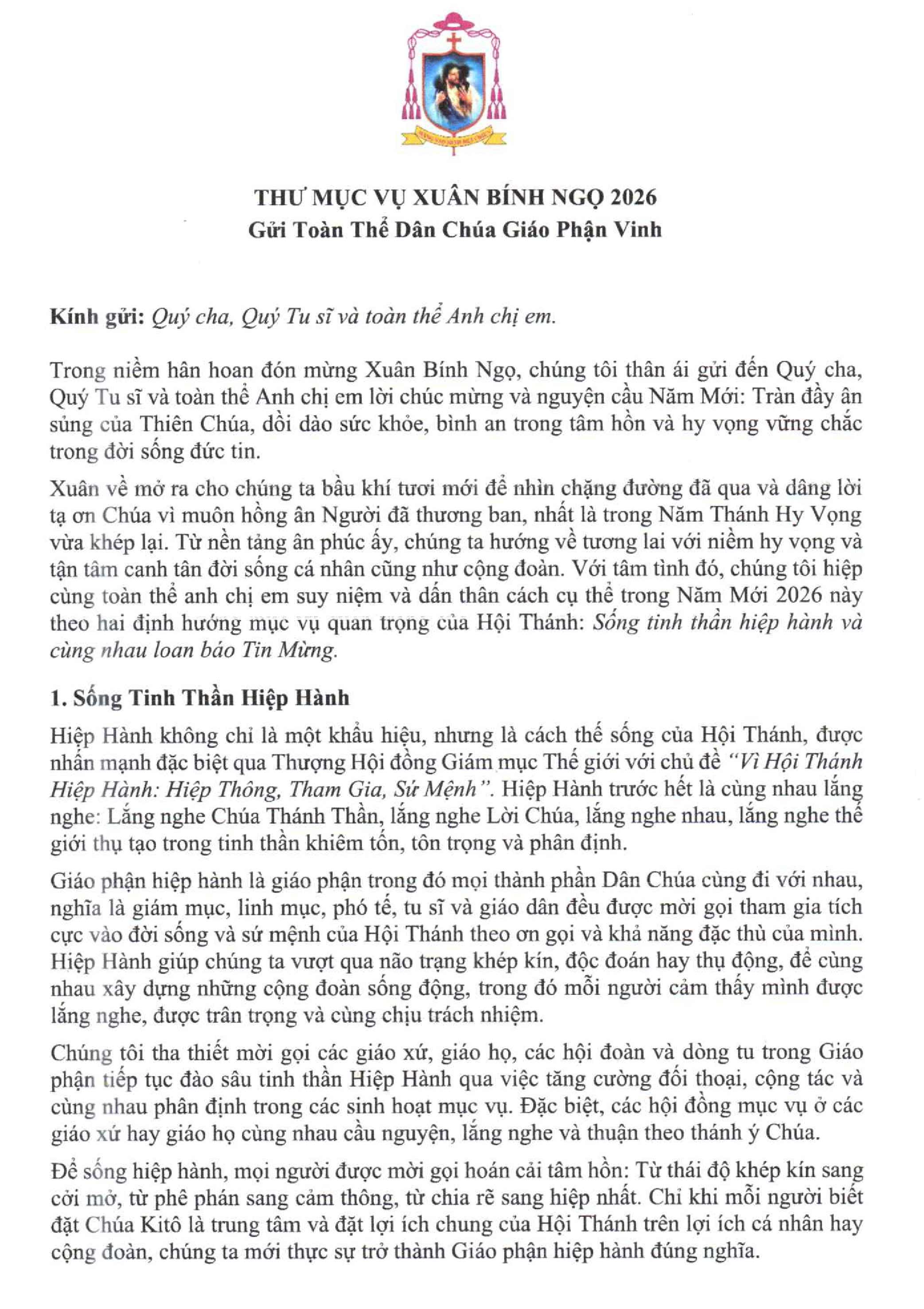 * Lưu ý: Xin quý Cha đọc và giải thích Thư Mục vụ này cho cộng đoàn trong Chúa Nhật VI thường niên và dịp Tết Bính Ngọ 2026